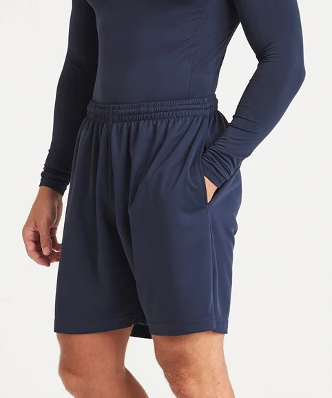 - These cool shorts feature an elasticated waistband with drawcords; a mesh lined inner, side pockets for storage, sweat wicking Neotericâ„¢ fabric and plenty of room to move during your workout.
